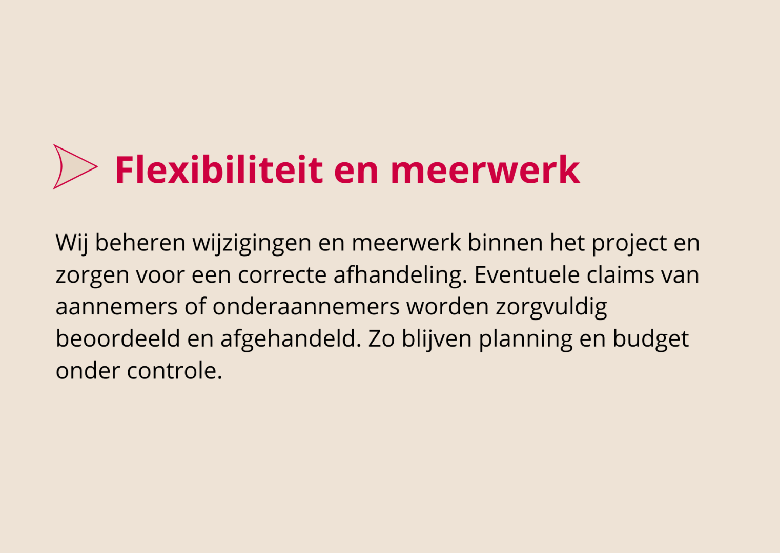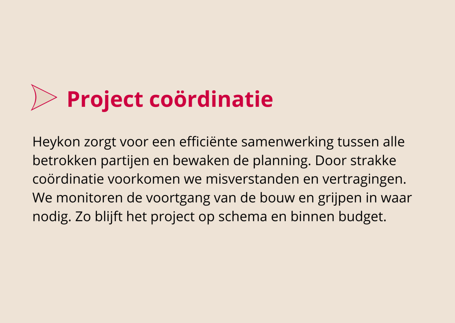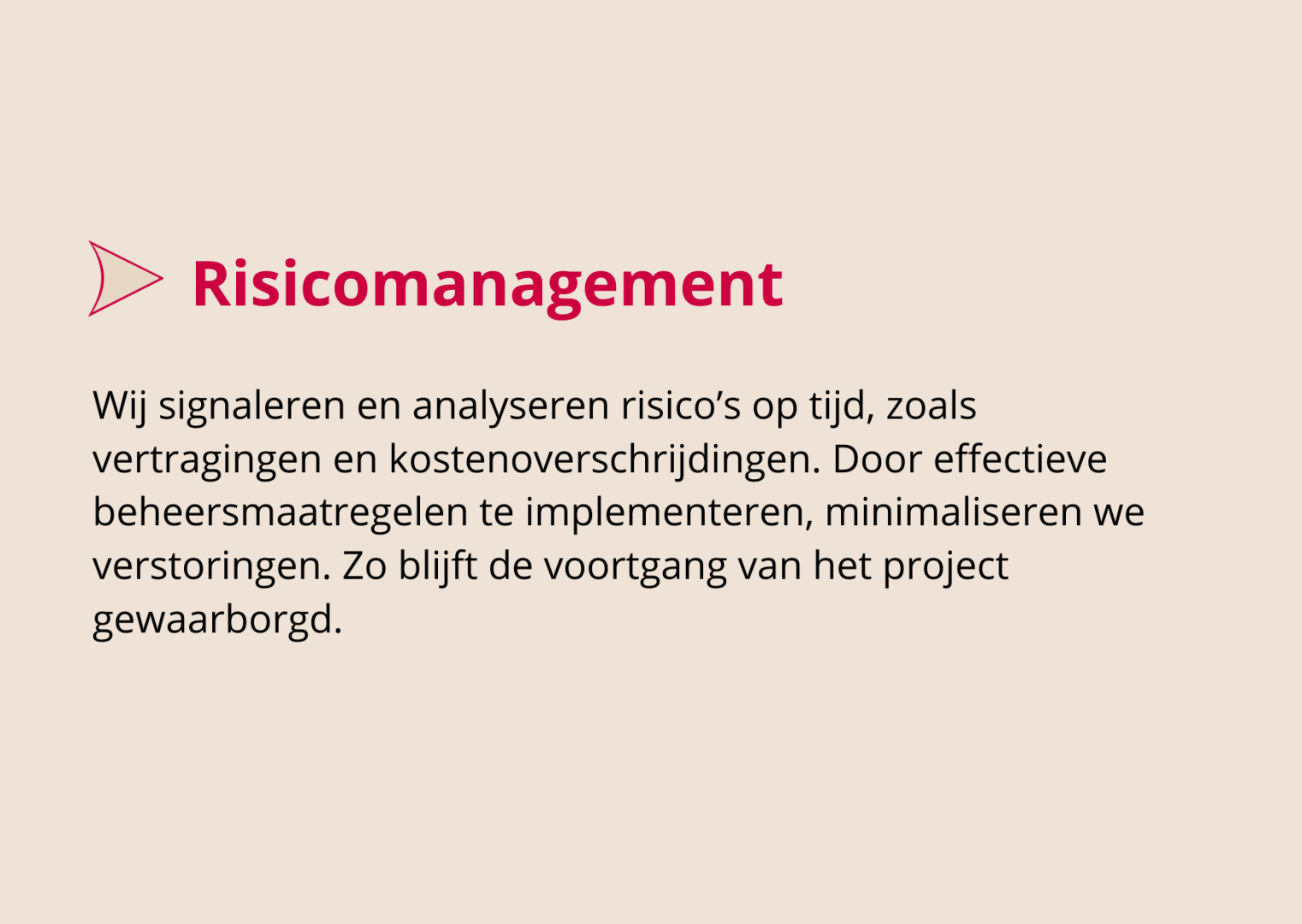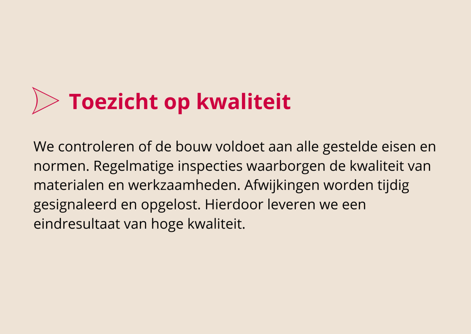Wij coördineren het bouwproces en bewaken de voortgang, zodat de werkzaamheden volgens planning en binnen budget verlopen. Dit doen we door afstemming tussen architecten, aannemers en leveranciers, en door toezicht te houden op kwaliteit, contractuele afspraken en naleving van wet- en regelgeving. Onze rol omvat ook risicobeheer en kostencontrole, waarbij we actief sturen op mogelijke afwijkingen en oplossingen aandragen.