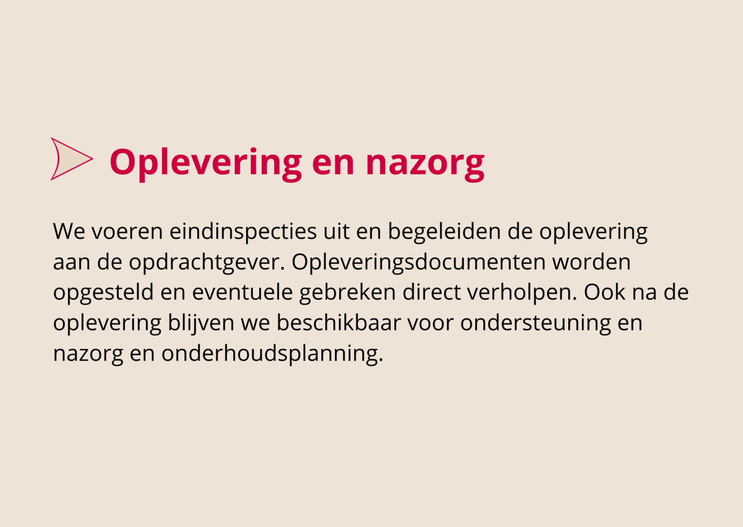 Daarnaast verzorgen wij de oplevering en nazorg, waarbij we eindinspecties uitvoeren en zorgen voor een soepele overdracht aan de opdrachtgever. Ook na de bouw blijven we betrokken, zodat eventuele aanpassingen of nazorg snel en efficiënt worden opgepakt. Onze directievoering garandeert een gestructureerd bouwproces, minimale risico’s en een eindresultaat van de hoogste kwaliteit.
